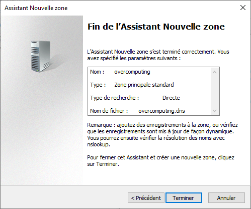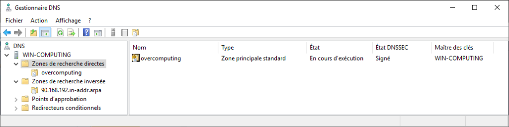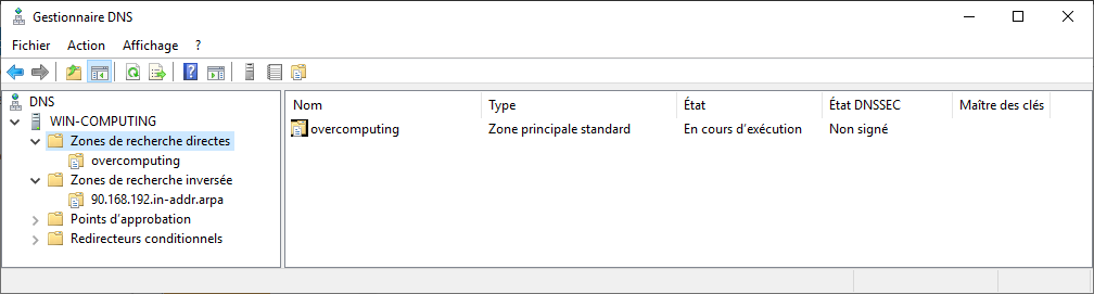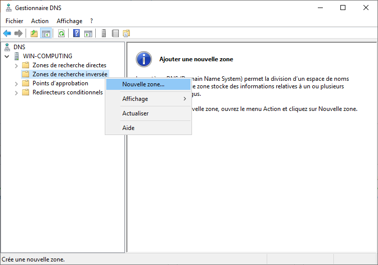 La zone de recherche directe permet la résolution d’un nom de domaine lié le plus souvent à un serveur, ou un poste de travail pour avoir son adresse IP. Ici on créé une nouvelle zone. Dans cette configuration, mon serveur « WIN-COMPUTING » possède l’IP 192.168.90.1, il sera donc possible d’accéder à ses ressources ( Serveur WEB / Fichiers / DNS / AD ) grâce à son IP ou de par son nom.