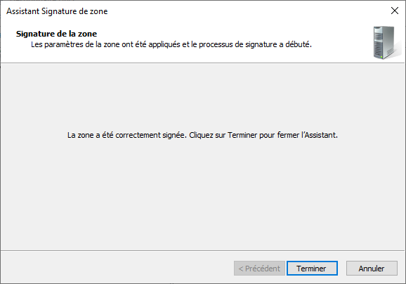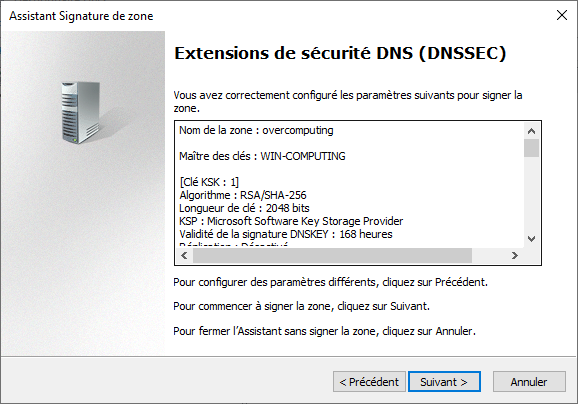 Pour cela, on fait un clic droit sur notre zone, on place sur curseur sur DNSSEC puis signer la zone.