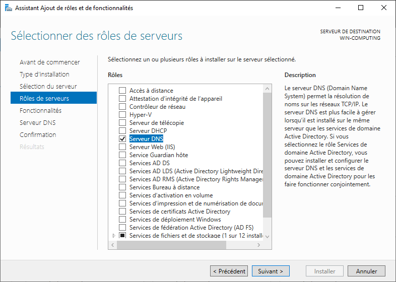 On sélectionne le rôle que l’on souhaite installer, ici le serveur DNS.