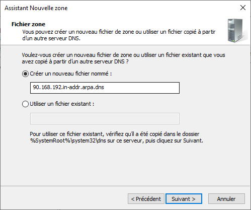 On choisit un nom pour notre fichier de zone, je mets le même que celui de mon nom de domaine avec l’extension en .dns.